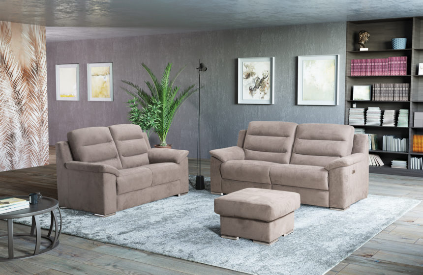 Salotto Vanity, composto da un divano 3 posti con 2 sedute dotate di sistema relax elettrico, un divano 2 posti fisso e un pouf. Un modello valorizzato dalla trapuntatura sullo schienale e sulla seduta.